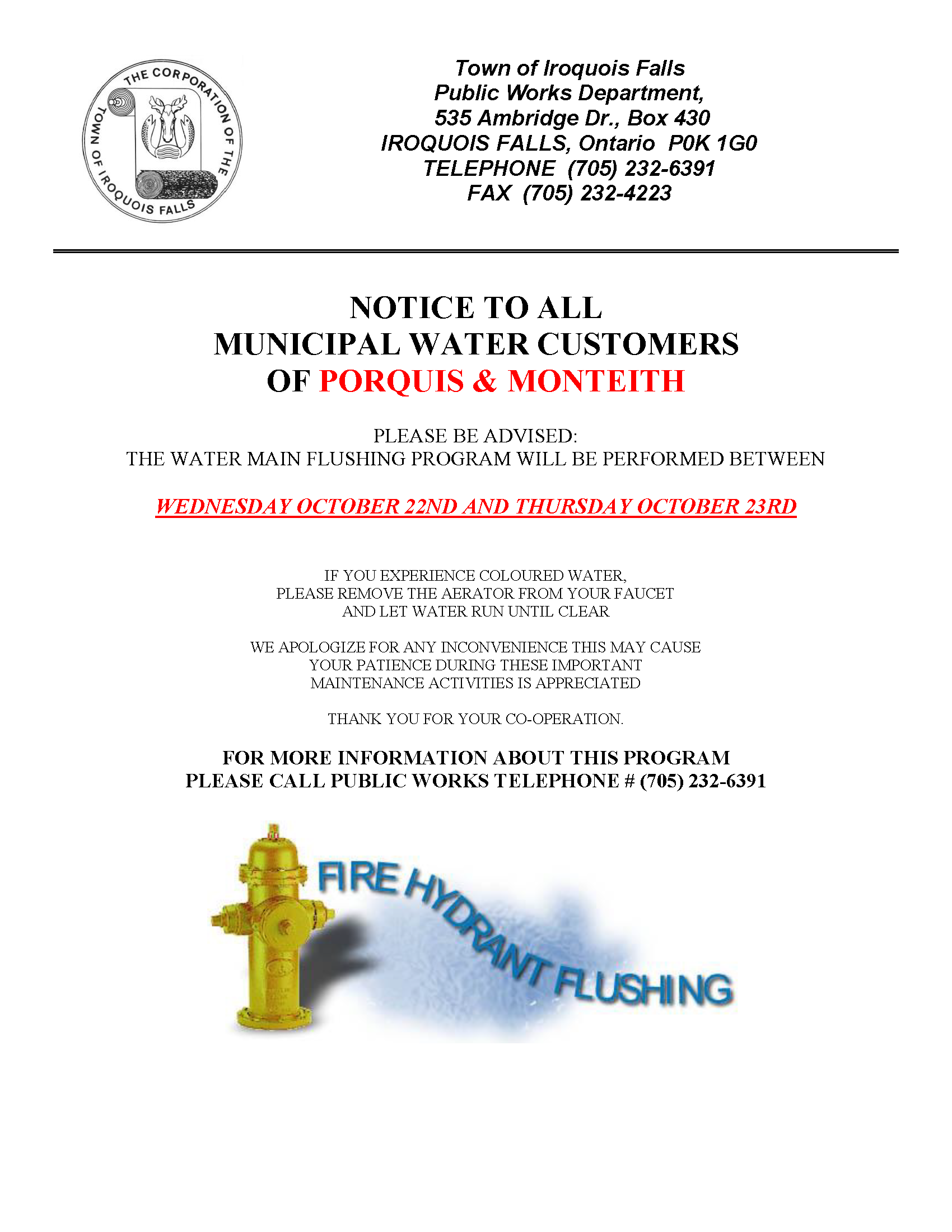 Notice of Hydrant Flushing - Porquis Junction & Monteith